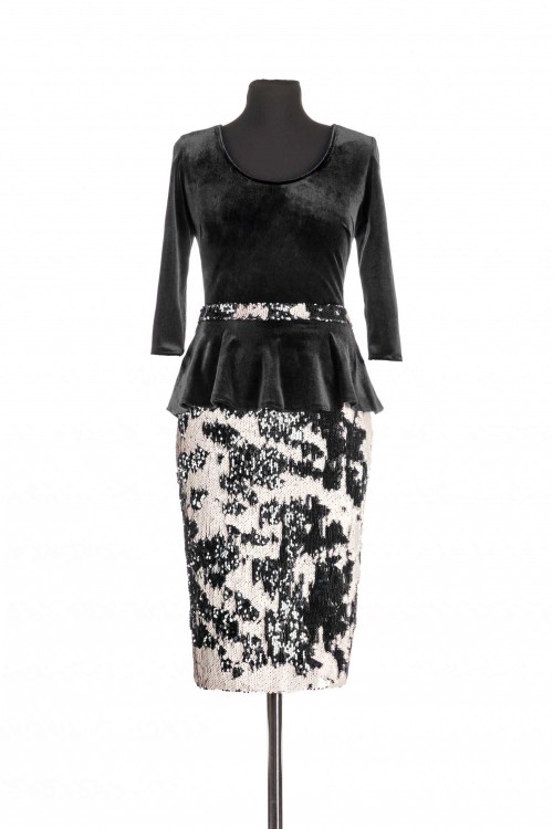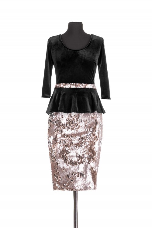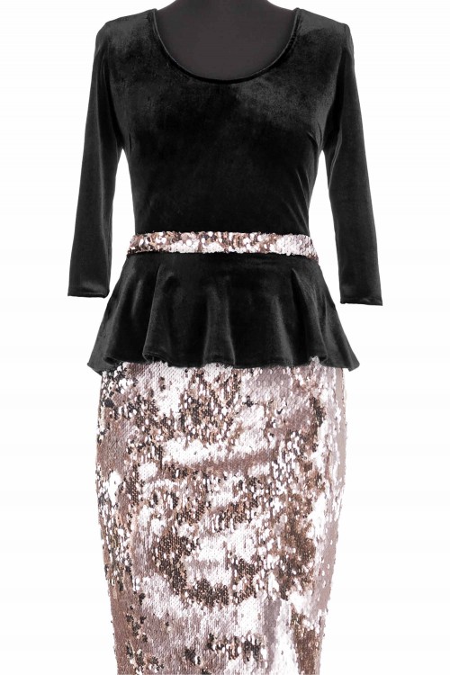 Rochie eleganta de seara cu o croiala conica. Rochia are topul din catifea, iar fusta este confectionata din paiete. Este o rochie cu o lungime medie ce prezinta peplum.