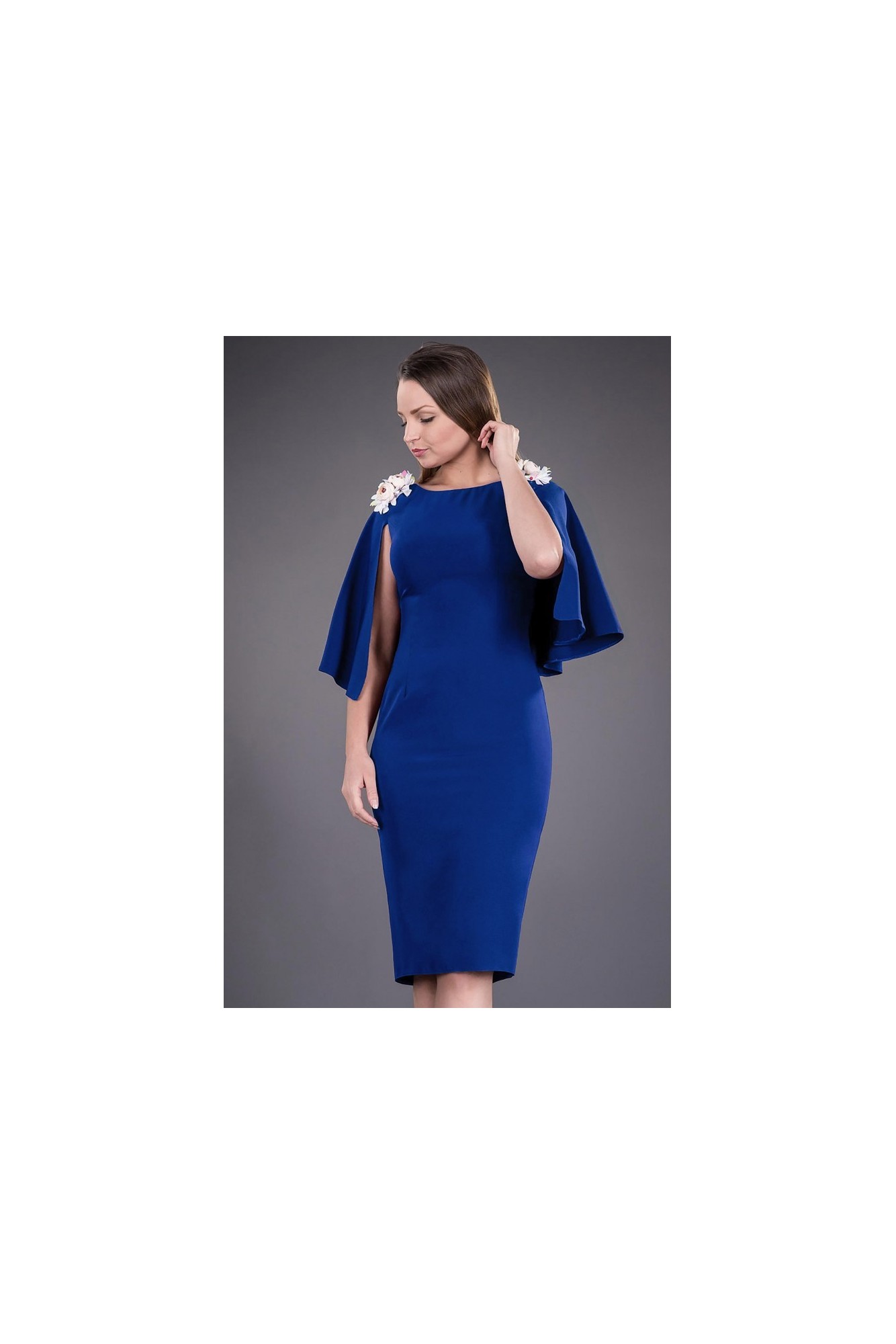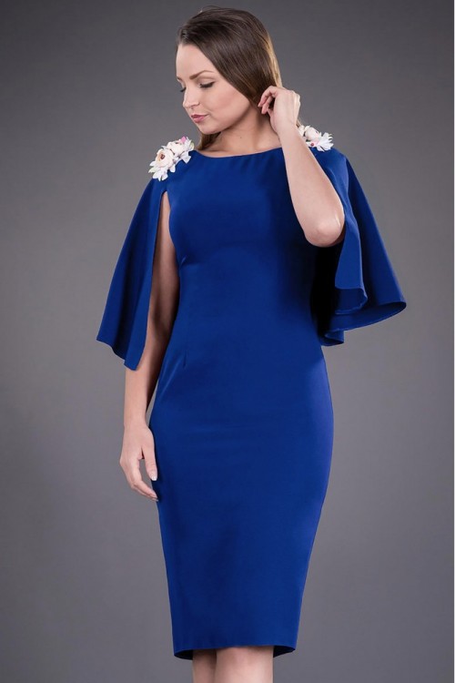 Rochie eleganta albastru regal cu o croiala cambrata, potrivita pentru evenimentele de si si seara. Este o rochie eleganta cu pelerina ce acopera partea de sus a bratelor. Rochia eleganta Angela are la spate decolteu in V.