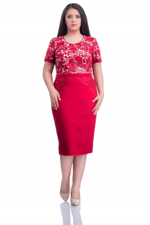 Rochie de seara din dantela macrame de culoare rosie. Rochia are o croiala cambrata ce pune in evidenta formele corpului. O rochie eleganta din dantela aplicata in partea de sus a bustului.