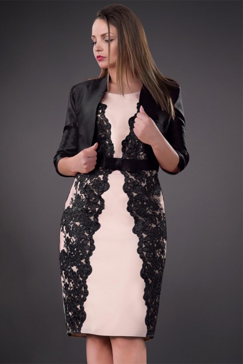 Compleu dama elegant confectionat din dantela de cea mai buna calitate si tafta. Este un compleu elegant din doua piese, sacou si rochie din dantela.