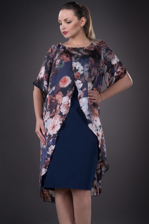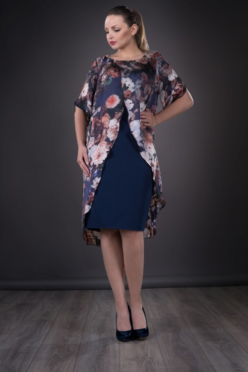 O rochie eleganta croita pe marimi mari confectionata din barbi(material usor elastic) si voal. Rochia are o croiala usor cambrata si un bolero cu design modern.