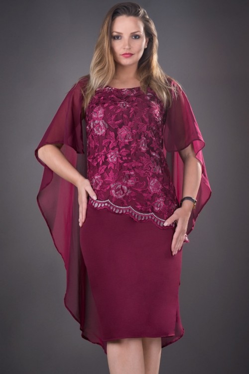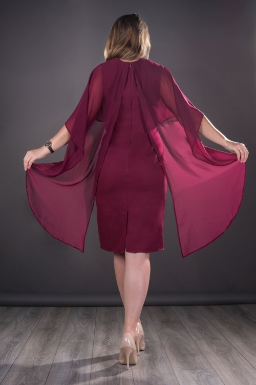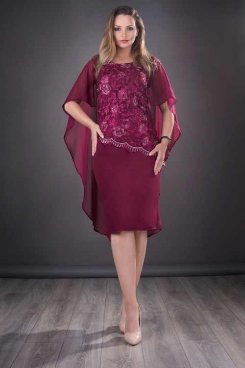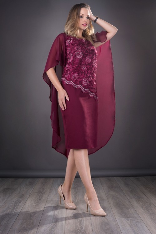 Rochie eleganta bordo din dantel si voal. Este or ochie deosebita, avand bustul din dantela si pelerina din voal. rochie potrivita pentru nunta, botez.