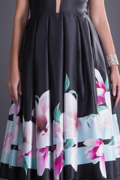 Rochie eleganta cu decolteu adanc. Rochie eleganta midi confectionata din tafta cu imprimeu floral. Rochia se regleaza la spate cu jnur(tip corset).