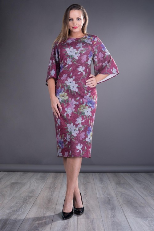 Rochie de zi cu maneci evazate, confectionata din jerse gros cu imprimeu floral si fir lame. Rochia are o un croi lejer ce se muleaza discret pe corp.