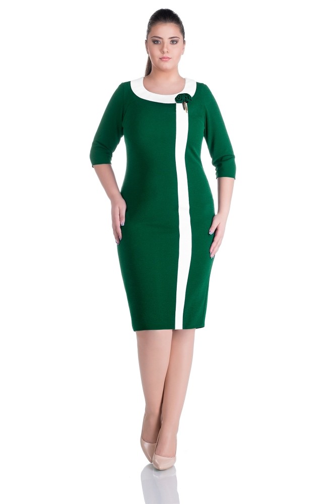 Rochie eleganta verde de zi confectionata din material elastic. Rochia are decolteu rotund la baza gatului si se inchide la spate cu fermoar. Rochie eleganta marimi mari cu brosa detasabila inclusa in pret. Rochie xxl din material de toamna-primavara.