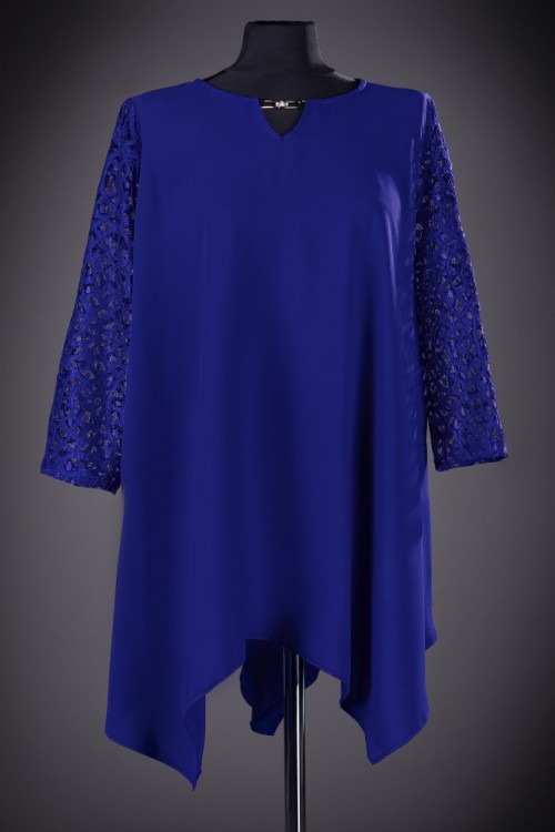 Bluza daca eleganta din voal albastru si maneca din dantela. Bluza dama in colturi croita pentru marimi mari. Bluza cu un croi lejer, bluza in cloturi ce se inchide la spate cu un nasture fin.