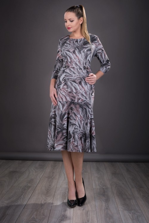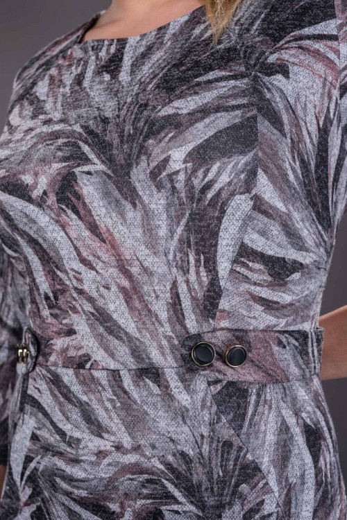 Rochie eleganta de zi confectionata din material elastic. Imprimeul in tonuri de gri si roz o transforma intr-o rochie ideala pentru birou sau petreceri cu prietenii. Rochia are o lungime medie ce trece de genunchi si se inchide la spate cu fermoar. Rochie cu decolteu rotund la baza gatului si maneca trei sferturi, potrivita pentru zilele racoroase de toamna-iarna.