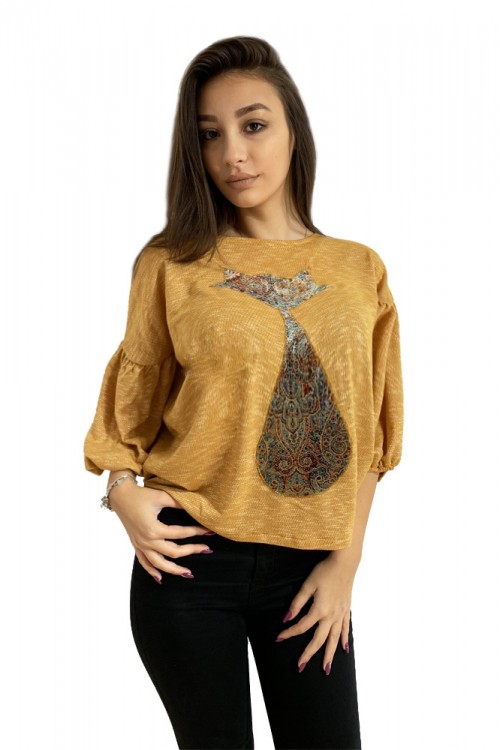 Bluza dama galben mustar cu pisica aplicata. Este o bluza lejera cu maneca incretita, potrivita atat la tinute casual cat si la birou. materialul este moale, placut pe corp.