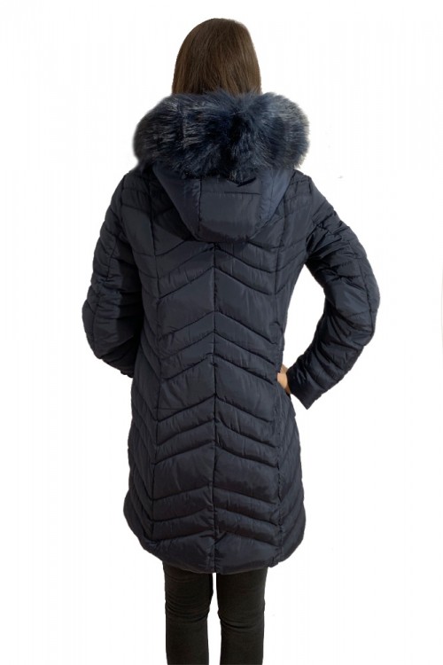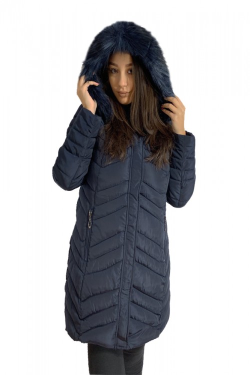 Geaca dama de iarna din fas bleumarin. Geaca are gluga si blanita artificiala la gluga.