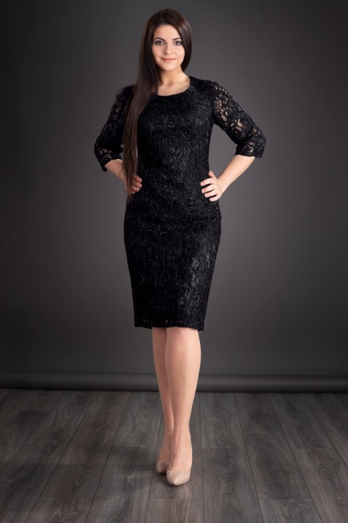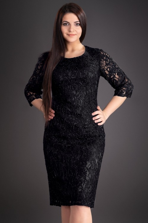 Rochie eleganta din dantela cu fir lame. Rochia este croita special pentru persoanele voluptoase. O rochie eleganta din dantela neagra cu maneca trei sferturi ce se inchide la spate cu fermoar.