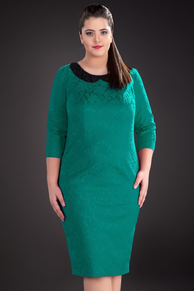 Rochie eleganta, confectionata din jaquard cu un frumos colier de margele aplicat la baza gatului. Rochia se inchide la spate cu fermoar si are maneca trei sferturi.