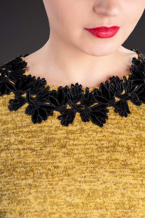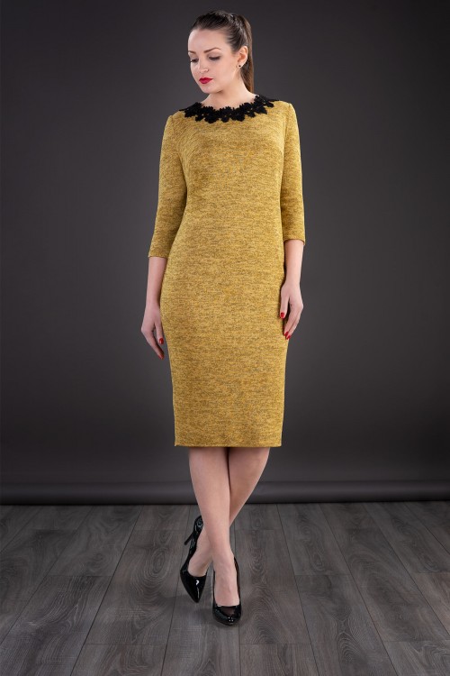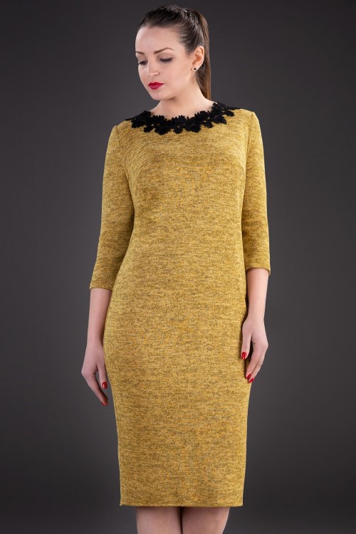 Rochie eleganta galbena, confectionata din material elastic. Rochia are aplicatii din dantela la baza gatului si se inchide la spate cu fermoar.