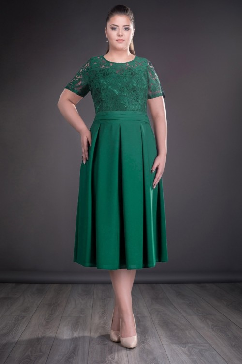 Rochie verde eleganta confectionata din dantela si voal. O rochie eleganta cu lungime medie pana la jumatatea gambei. Rochia are maneca scurta si se inchide la spate cu fermoar.
