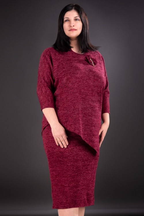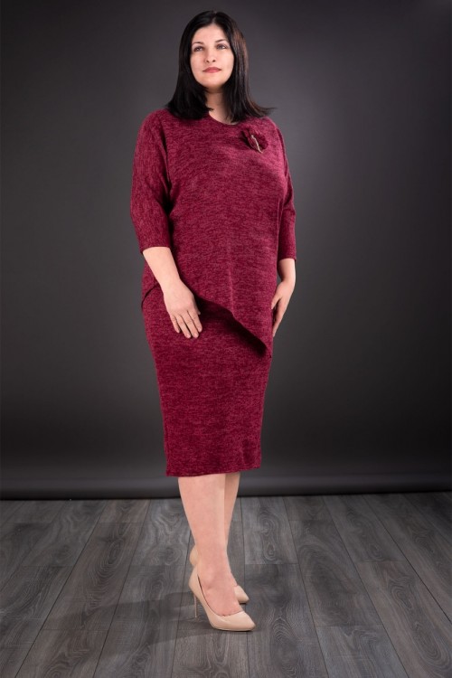 Compleu elegant de dama din material elastic bordo. Compleul este compus din doua piese, bluza asimetrica si fusta.
