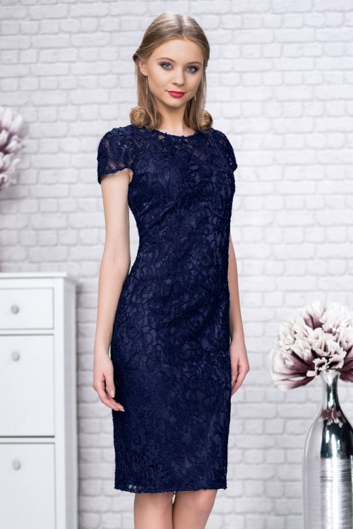 Rochie eleganta din dantela bleumarin cu maneca scurta. Rochia are un design modern avand ce se cambreaza discret pe corp. Rochia este in partea din spate cu decolteu mic in V si se inchide cu fermoar. Confectionata dintr-o dantela special cu fir lame in compozitie si captuseala din saten, aceasta rochie este perfecta pentru evenimentele speciale de genul nunta, botez, onomastica.