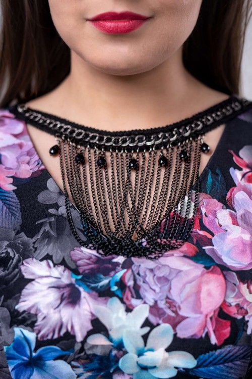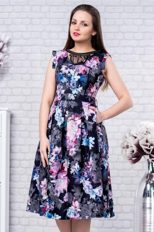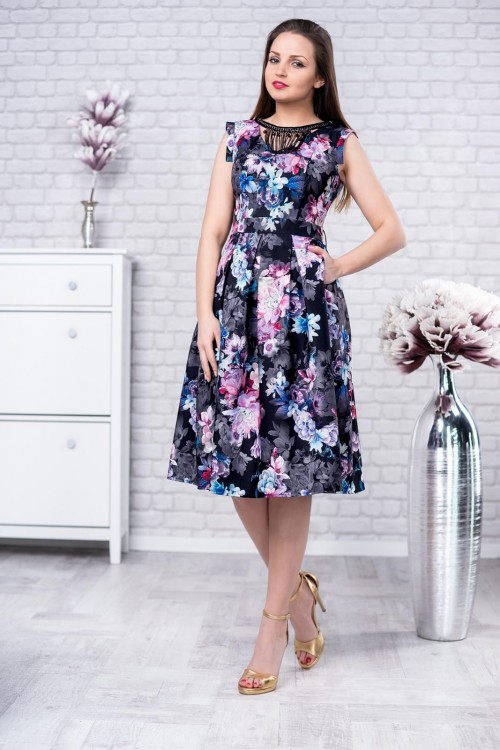Rochie eleganta in clos cu imprimeu floral. O rochie cu decloteu discret si croi lejer in clos. Rochie eleganta cu buzunare si lungime midi.