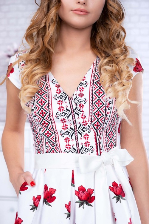 Rochie eleganta alba cu motive traditionale. Rochie eleganta cu decolteu perfecta pentru botez sau petreceri de vara. O rochie cu imprimeu traditinal ce imbina traditionalul cu modernul, avand buzunare si cordon in talie.